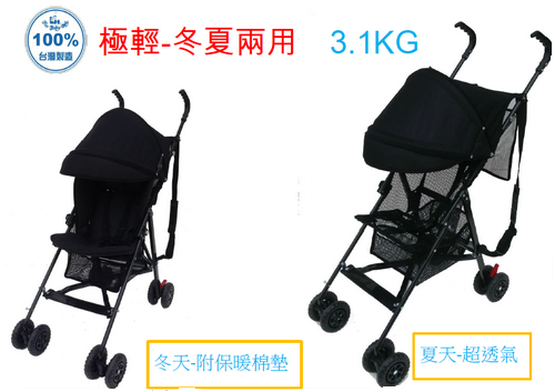 單人推車:3.1KG極輕款-冬夏兩用-椅背固定式,無法平躺,售價2,300元,可加購可拆式扶手(售價300元).最大優點是重量僅3.1KG,椅背坐墊可拆成全網,附冬用棉墊(顏色隨機),真正做到冬夏兩用.五點式安全帶.承載至15KG. (0.5歲-4歲可用)