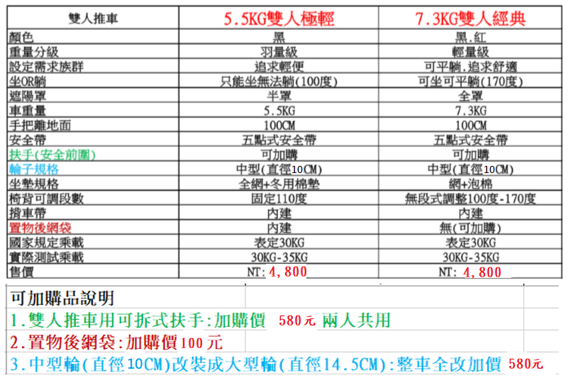 雙人經典(黑色)-7.3KG-5點式安全帶-可平躺雙人推車